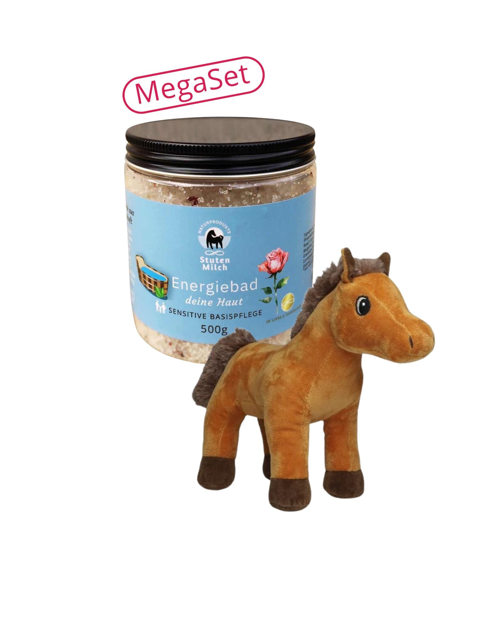 Genießen Sie das Bio Stutenmilch Energiebad „deine Haut“ mit 500 g voller natürlicher Pflege. Die Kombination aus echtem Meersalz, getrockneten Kräutern, Rosenblüten und wertvoller Stutenmilch beruhigt sensible Haut und schenkt Ihnen wohltuende Entspannung. Ideal, um den Alltagsstress hinter sich zu lassen und neue Energie zu tanken. Hergestellt aus steirischer Bio Stutenmilch aus tierfreundlicher Kreislaufwirtschaft – für ein nachhaltiges Pflegeerlebnis. Gönnen Sie sich dieses besondere Verwöhnbad und spüren Sie, wie Ihre Haut auflebt. + Plüschpferd Frederike 25cm groß!